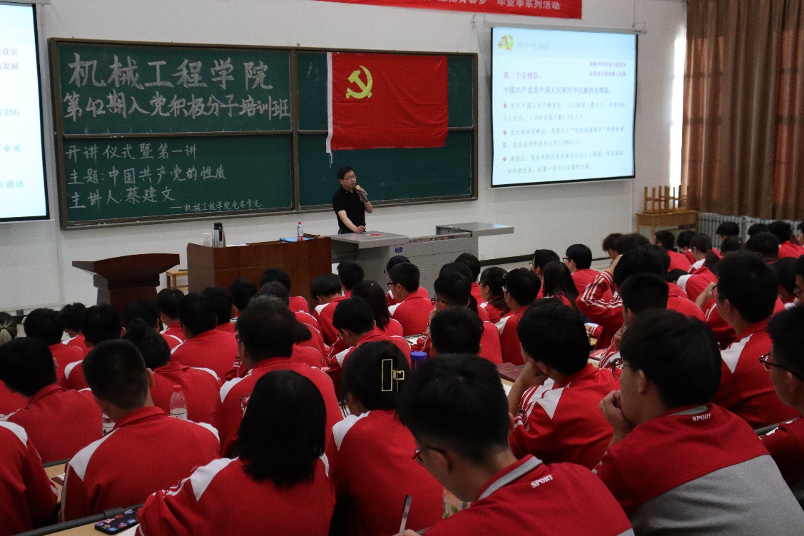为严肃党的组织流程,提高入党积极分子的政治觉悟,深化青年员工对党的认识,根据党员发展工作和党史学习教育的统一安排,5月24日晚,银河集团官网在鄠邑校区天工楼115教室举行第42期入党积极分子培训班开班仪式暨第一次集中授课。机械工程公司党委书记蔡建文为全体入党积极分子授课,主题为《中国共产党的性质》,公司党委副书记刘冰参加。开班仪式由2020级团总支书记马舒宇主持。